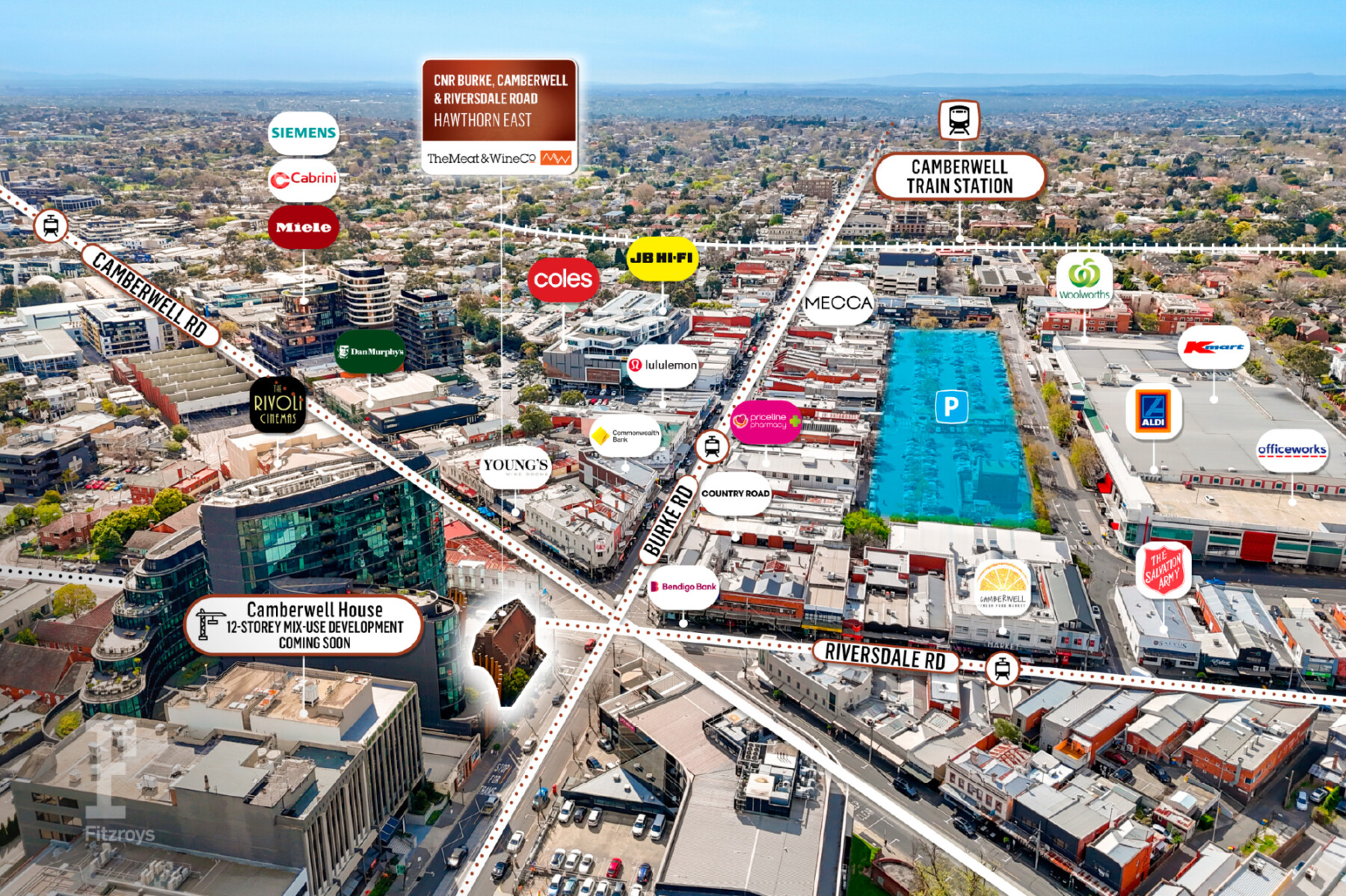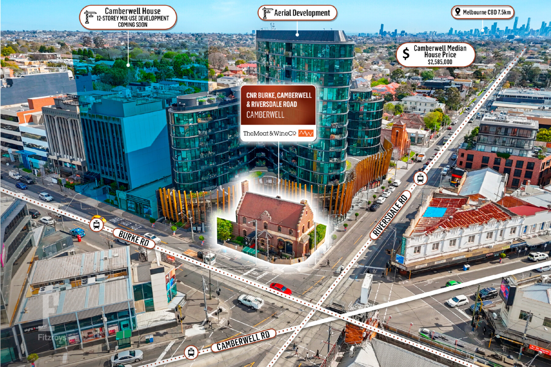 Fitzroys is pleased to present this corner trophy asset on Camberwell Junction – a high profile investment leased to one of Melbourne’s most well-regarded hospitality groups - Meat & Wine Co, located on the corner of Burke, Riversdale and Camberwell Road and for sale via public on site auction Friday 6th March at 1:30pm.