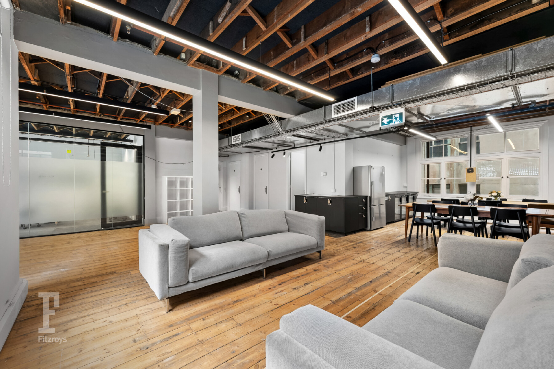 Level 3 (280sqm) - Includes a fully self-contained creative whole floor featuring a boardroom, meeting room, podcast/quiet room, open-plan workspace with workstations, and a dedicated kitchen and breakout area.